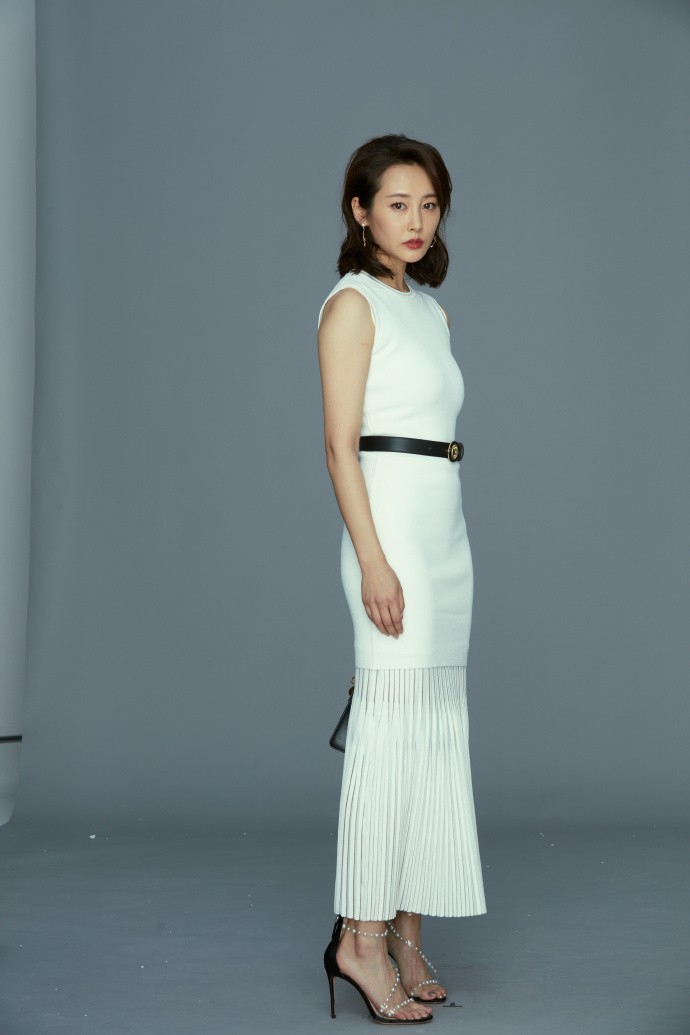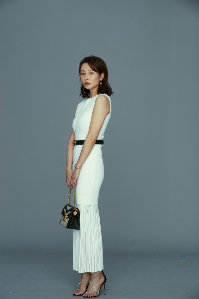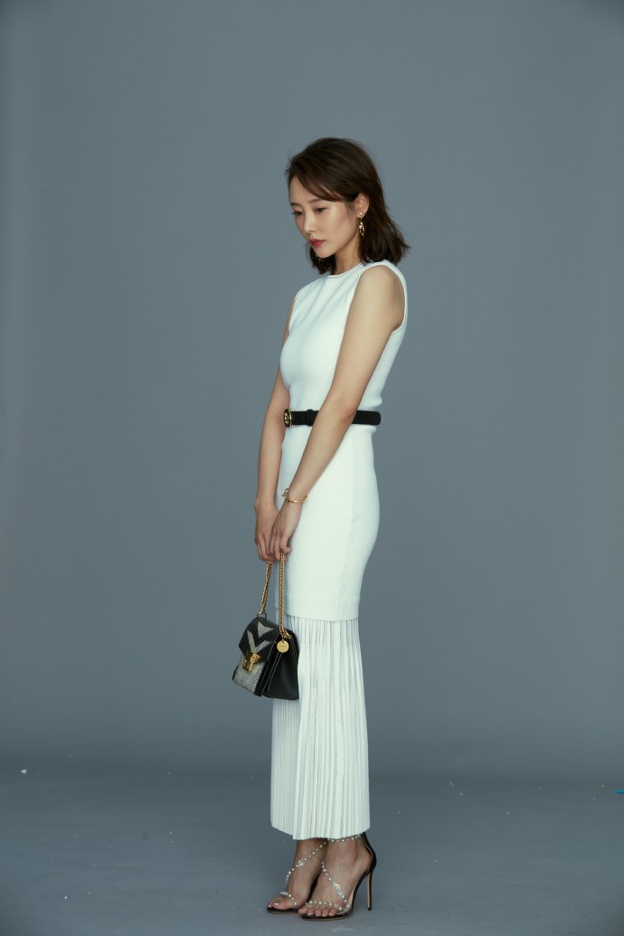 白色,往往是最考验气质与身材的颜色。李纯选择的这件白色包臀裙,设计上并无过多繁复装饰,仅凭精准的剪裁与面料本身的质感,便将女性身体的优雅线条完美呈现。裙身贴合身形,自腰间至裙摆的弧度自然流畅,既展现了女性的性感魅力,又丝毫不显俗艳,反而透着一种高级的克制与清爽。